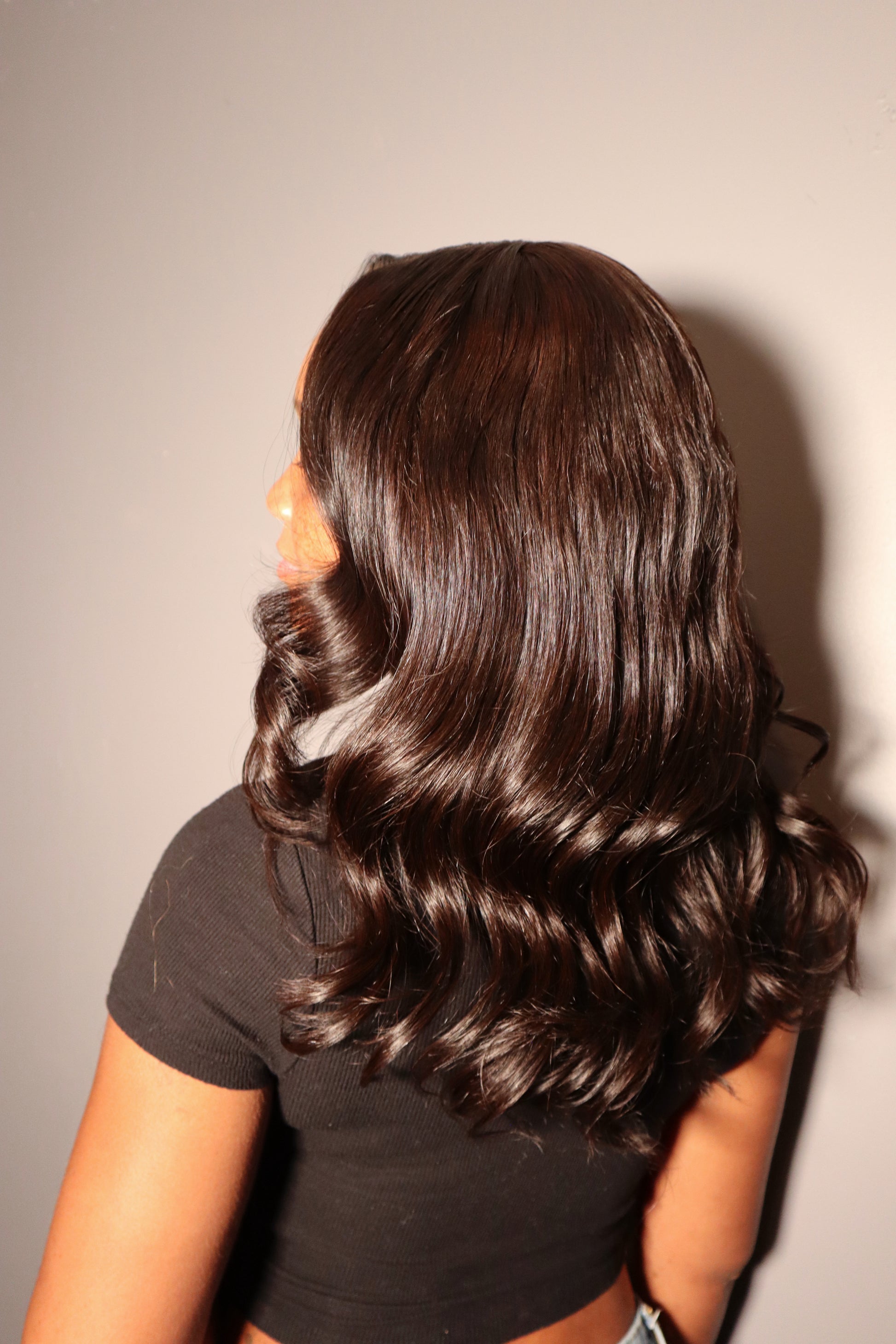 Our Hazel Wig is a 22" 5x5 HD lace closure wig created with 4 top quality straight virgin hair bundles. This gem is colored to a subtle, soft brown tone, layered and curled styled with a middle part. *pictured is 16*